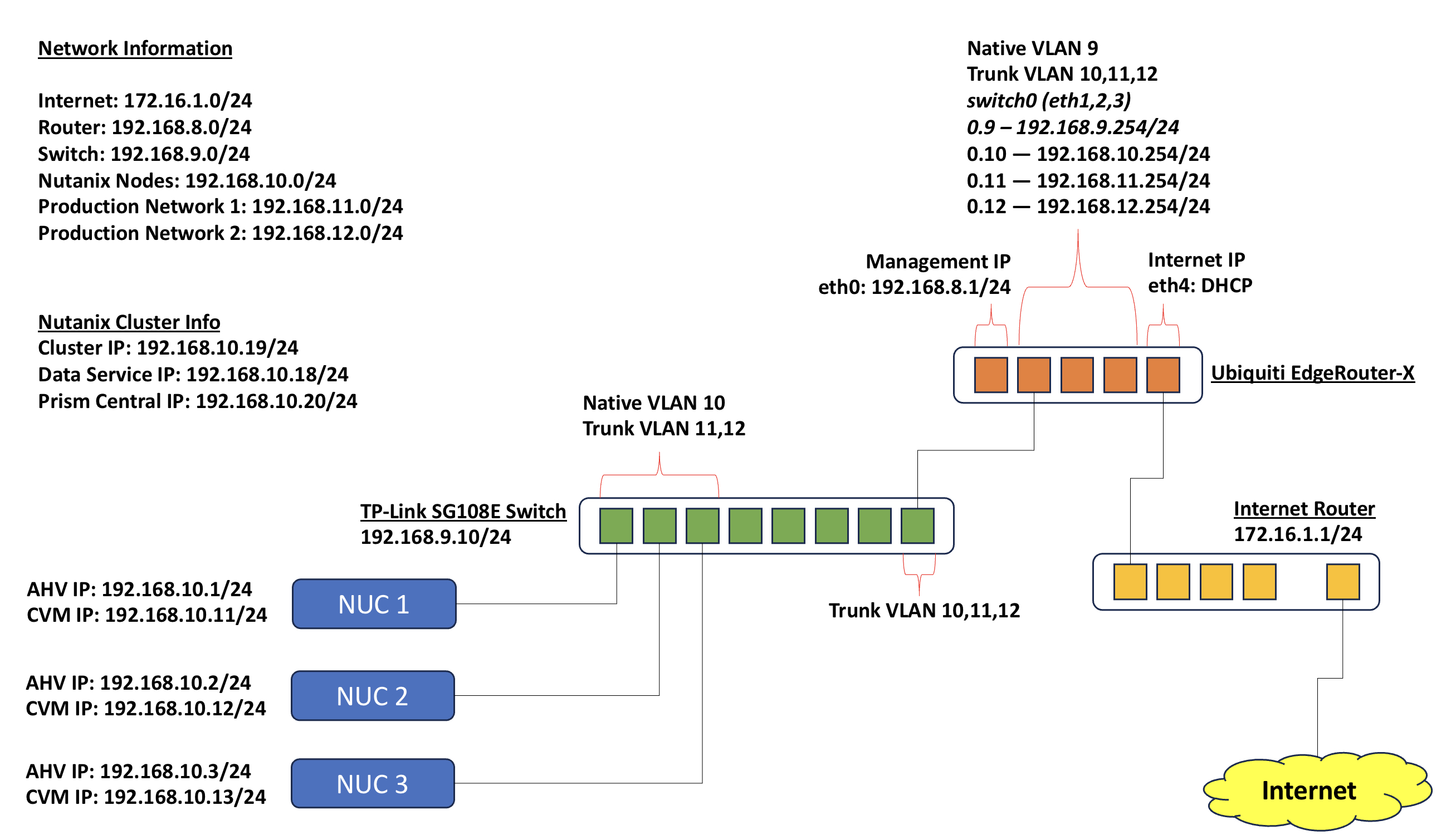 The home lab architecture consist of a router (Ubiquiti EdgeRouter-X) with 802.1Q VLAN and sub-interfaces gateway with routing capabilities, a switch (TP-Link SG108E) with 802.1Q VLAN and native VLAN capabilities and 3 Intel NUCs, where each Intel NUC represents a physical compute + storage node resources for hosting workloads.