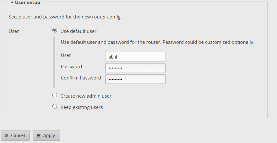 Step 10: Let’s key in a new password for the user “ubnt” and select the “Apply” button