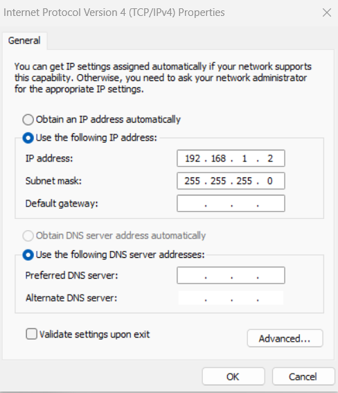 Step 2: Configure the management laptop network IP to be 192.168.1.2 with subnet mask 255.255.255.0