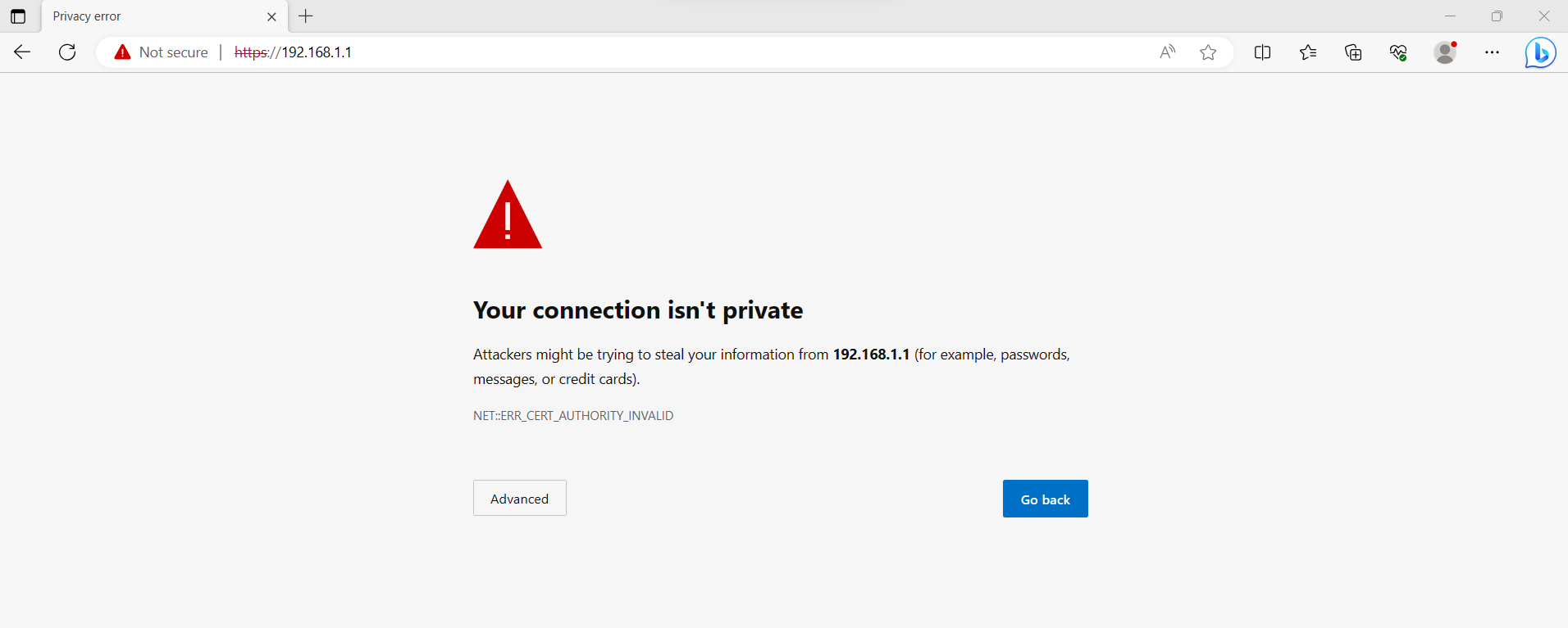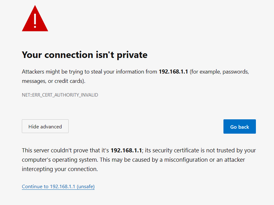 Step 4: Select “Advanced” and click on “Continue to 192.168.1.1 (unsafe)”