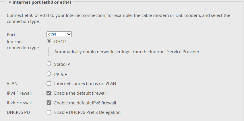 Step 8: Let’s choose eth4 to be our “Internet” port. We can leave the rest of the setting in “Internet port (eth0 or eth4)” setting as their default