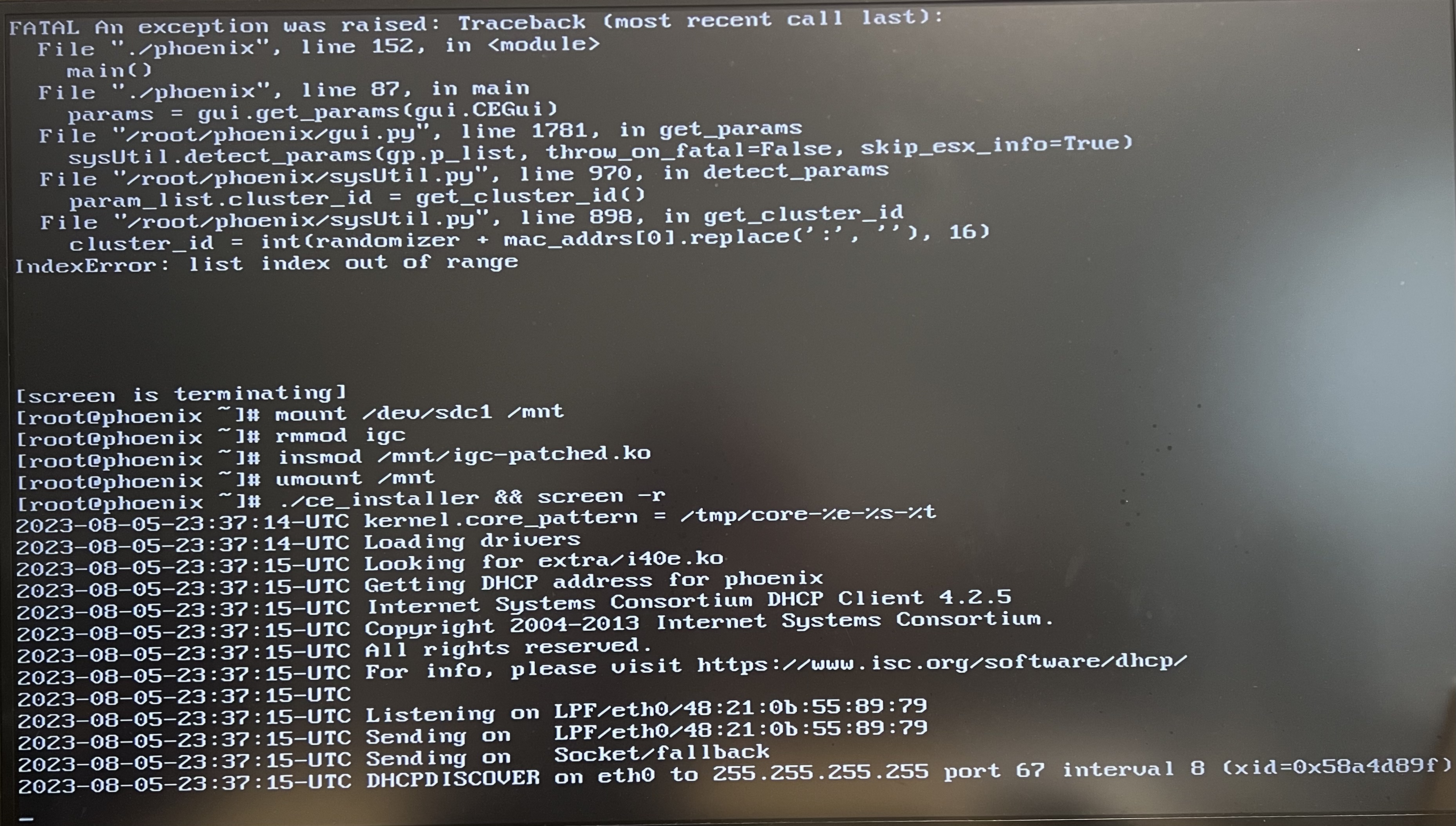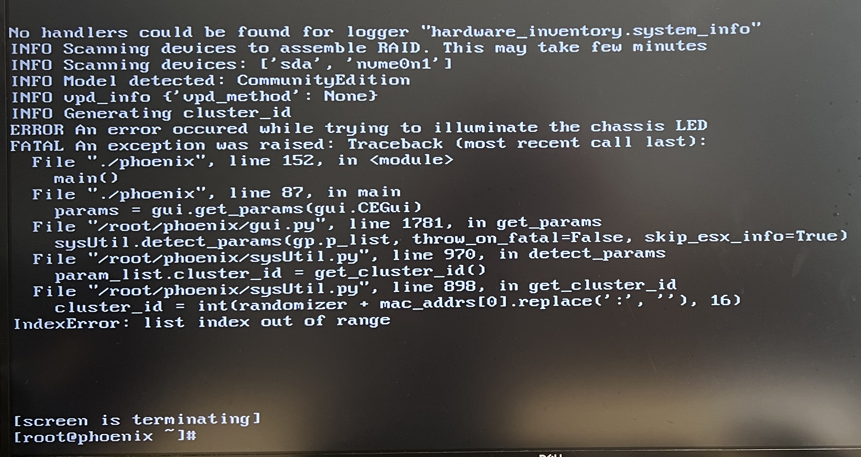 Step 4: Wait for the thumb drive to boot and you will see an error screen stating some “list index out of range” and you will see a bash input screen that shows “[root@phoenix ~]#”. This is because Intel NUC’s network interface card (NIC) driver is not found in Nutanix CE binary.