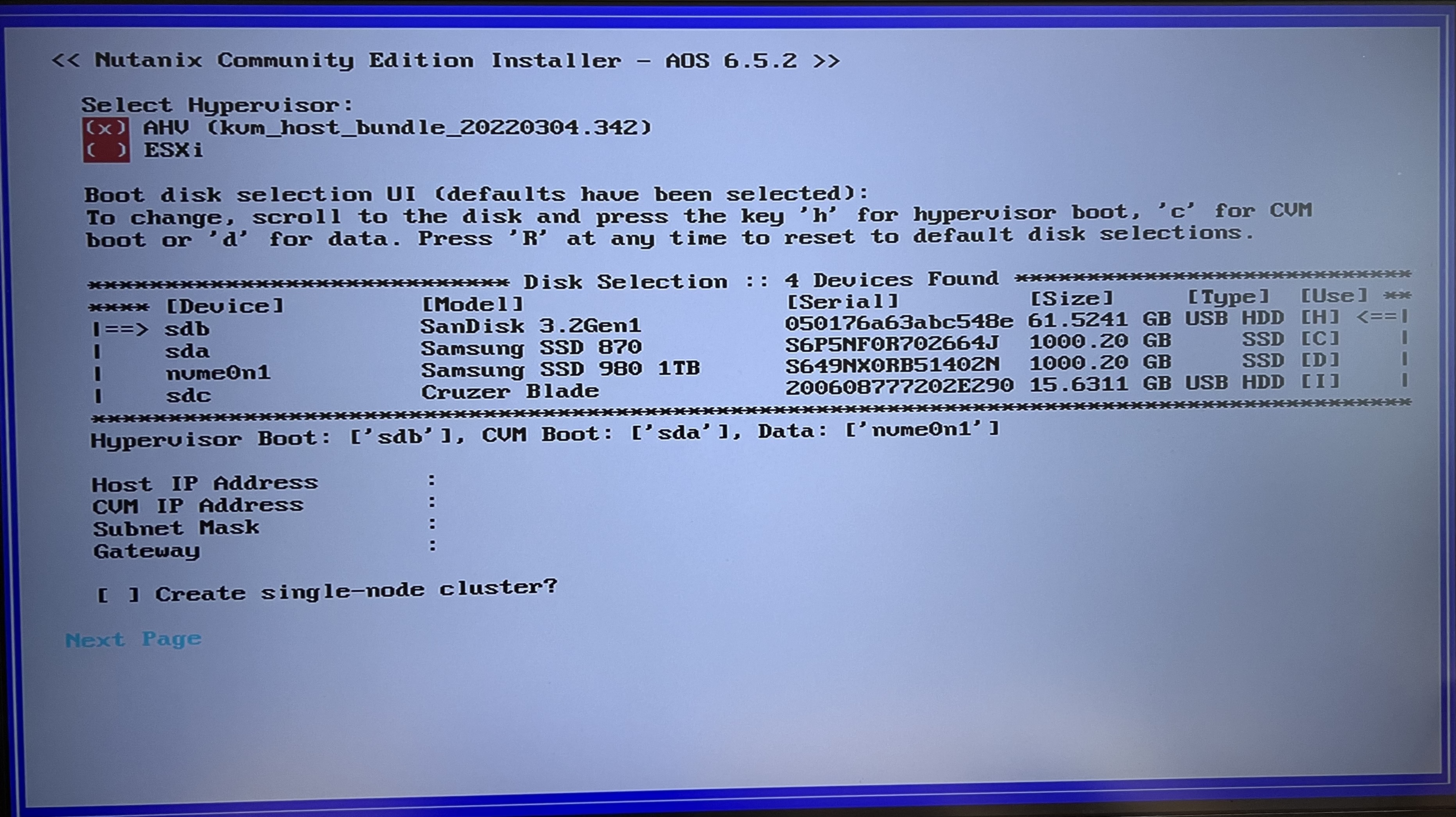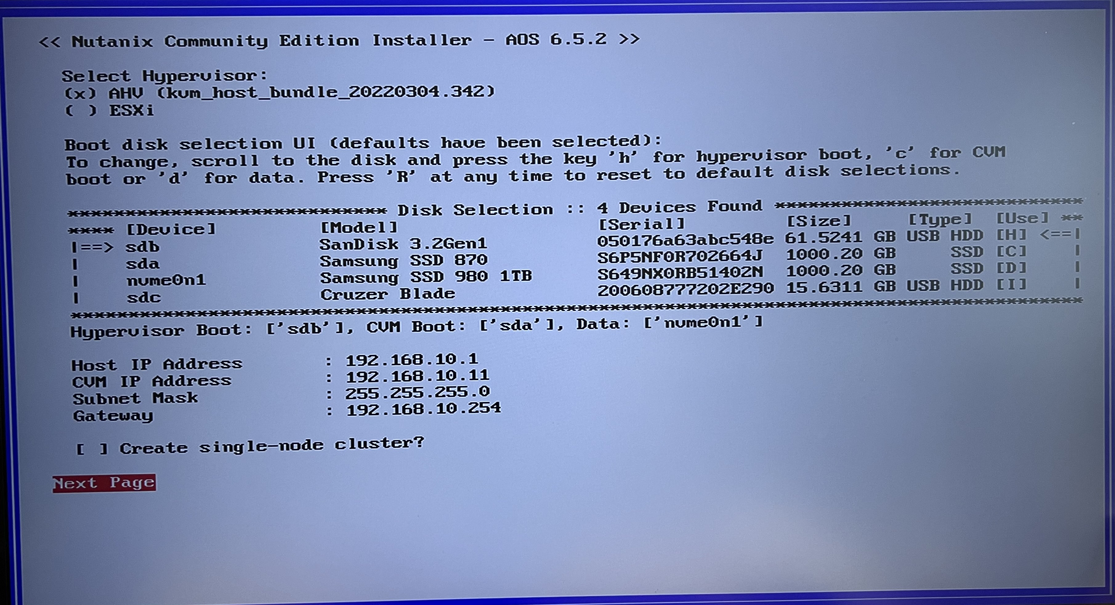 Step 14: Let’s enter the IP address for the 1st Nutanix node as stipulated in the “Nutanix IP Address List” table above, ensure the “Create single-node cluster” option is not selected and click “Next Page”.