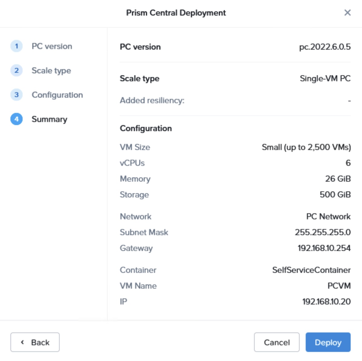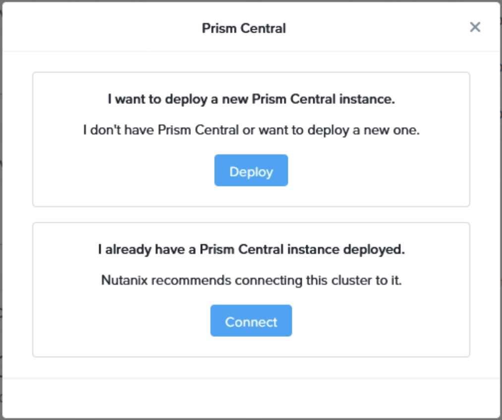 Step 2: Click on “Deploy” on the pop up that says “I want to deploy a new Prism Central instance”