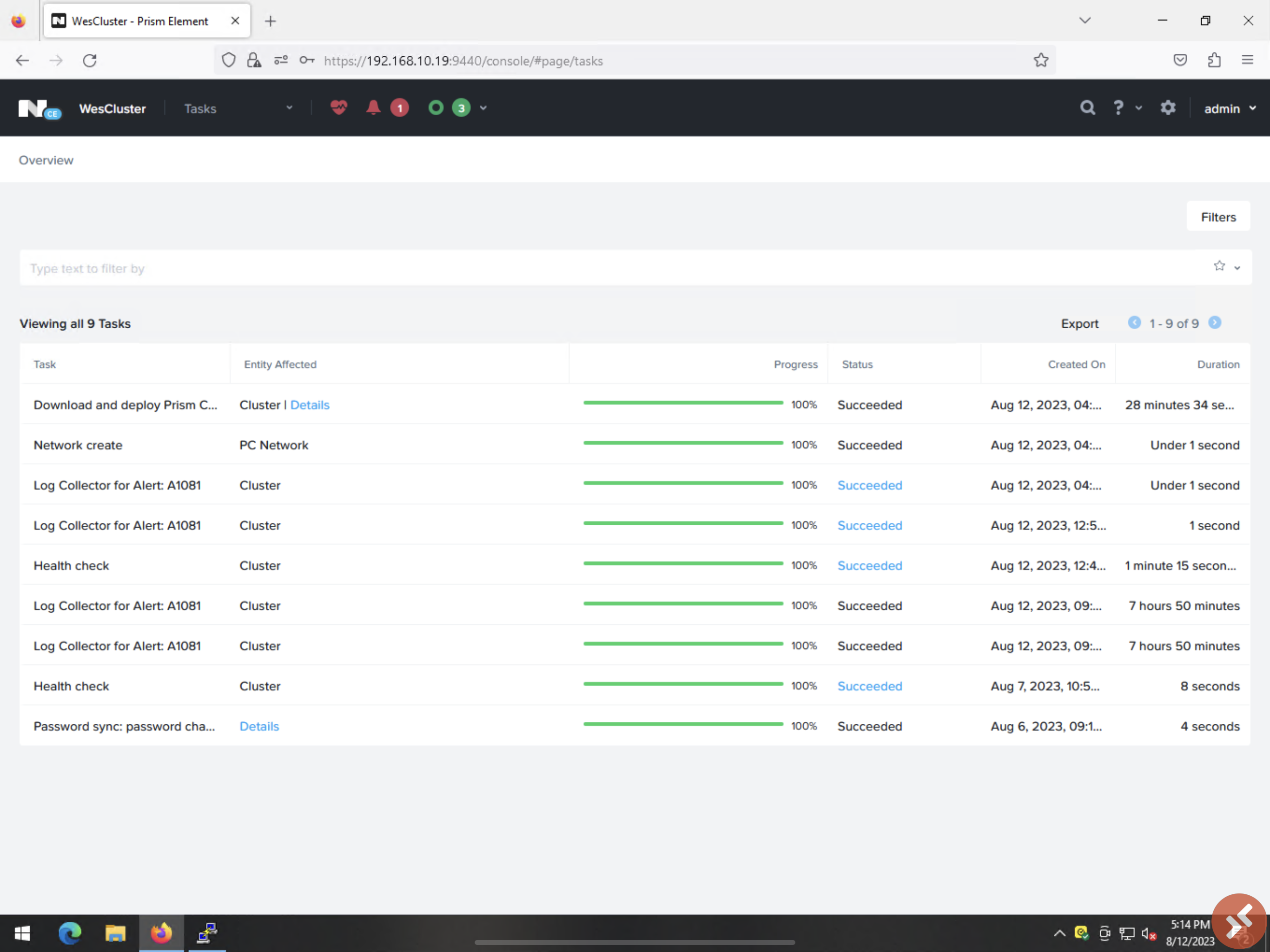 Step 9: Monitor the “Tasks” and ensure that you see the task “Download and deploy Prism Central” shows “100%” and “Succeeded”. With this, Prism Central is deployed.
