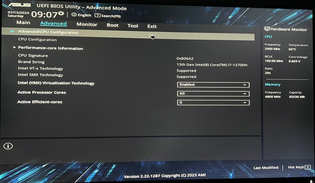 Step 1: Boot into the BIOS by pressing DEL when the Asus PN64-E1 boots at its BIOS splash screen