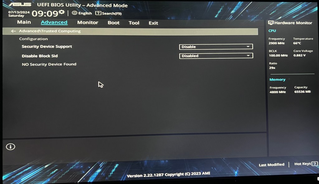 - Security Device Support —> Disable
